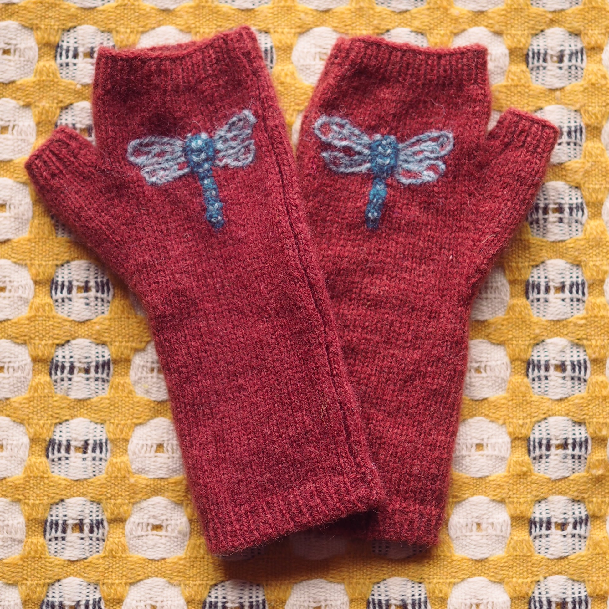 Handmade pink fingerless gloves featuring a hand-embroidered Blue Dasher Dragonfly. An all year round accessory made to keep your hands warm while keeping your fingers free. Made from Scottish Shetland wool. Each glove is completely unique due to the hand-embroidery.