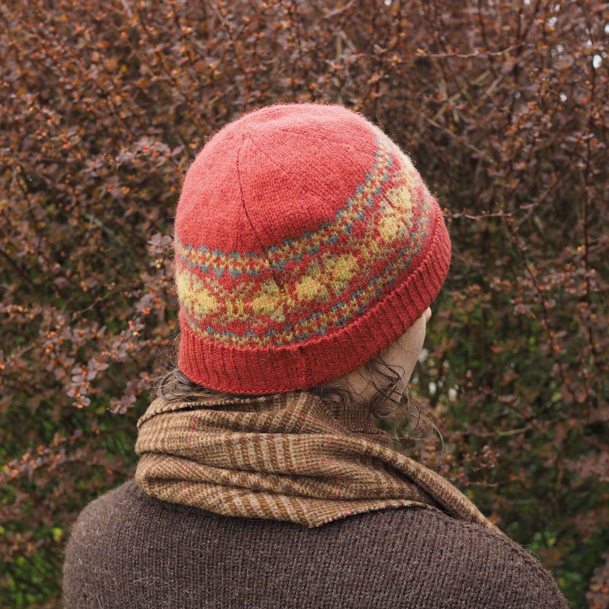 Handmade Flora Fairisle Hat. Featuring a colourful fairisle pattern and a cosy folded brim to keep your ears warm.