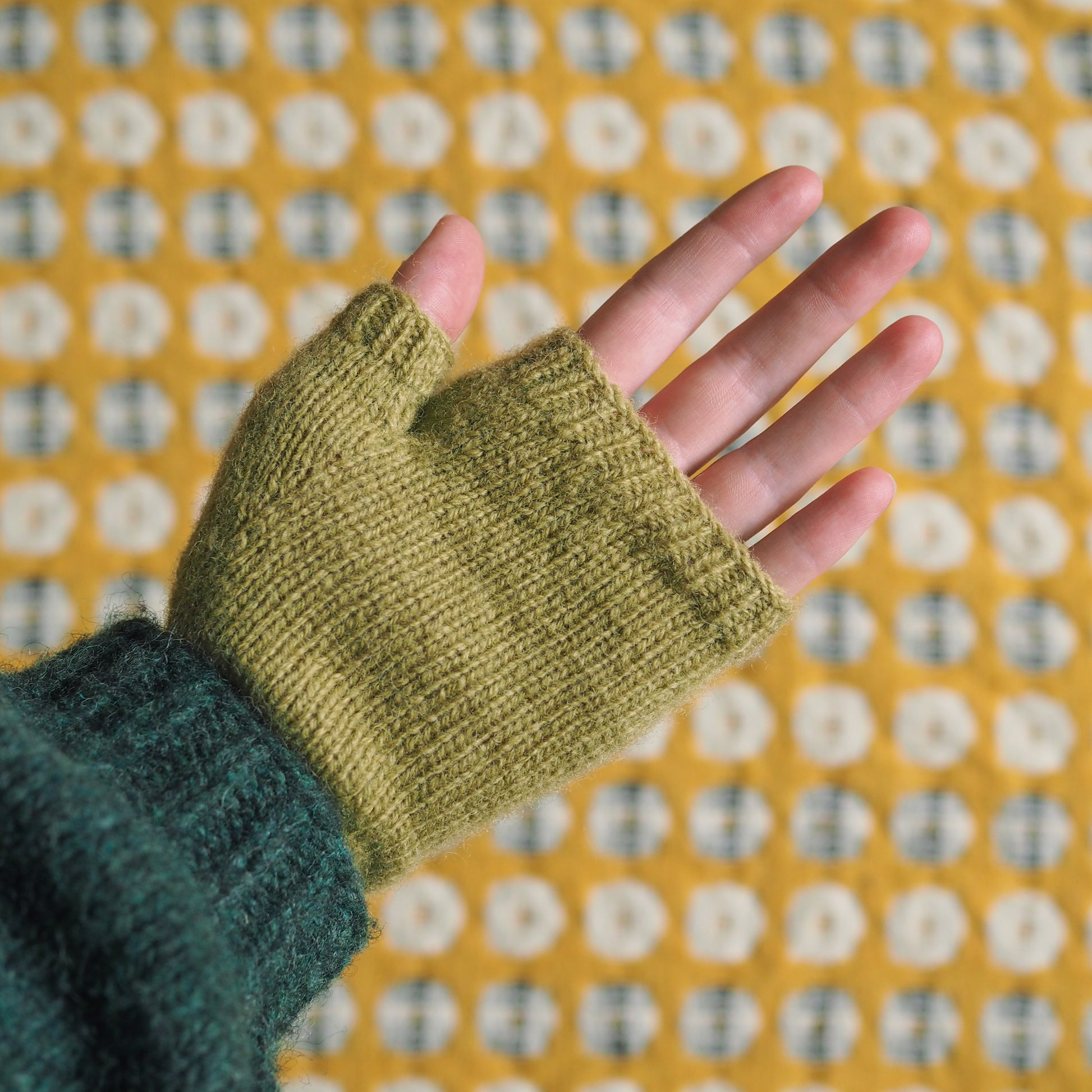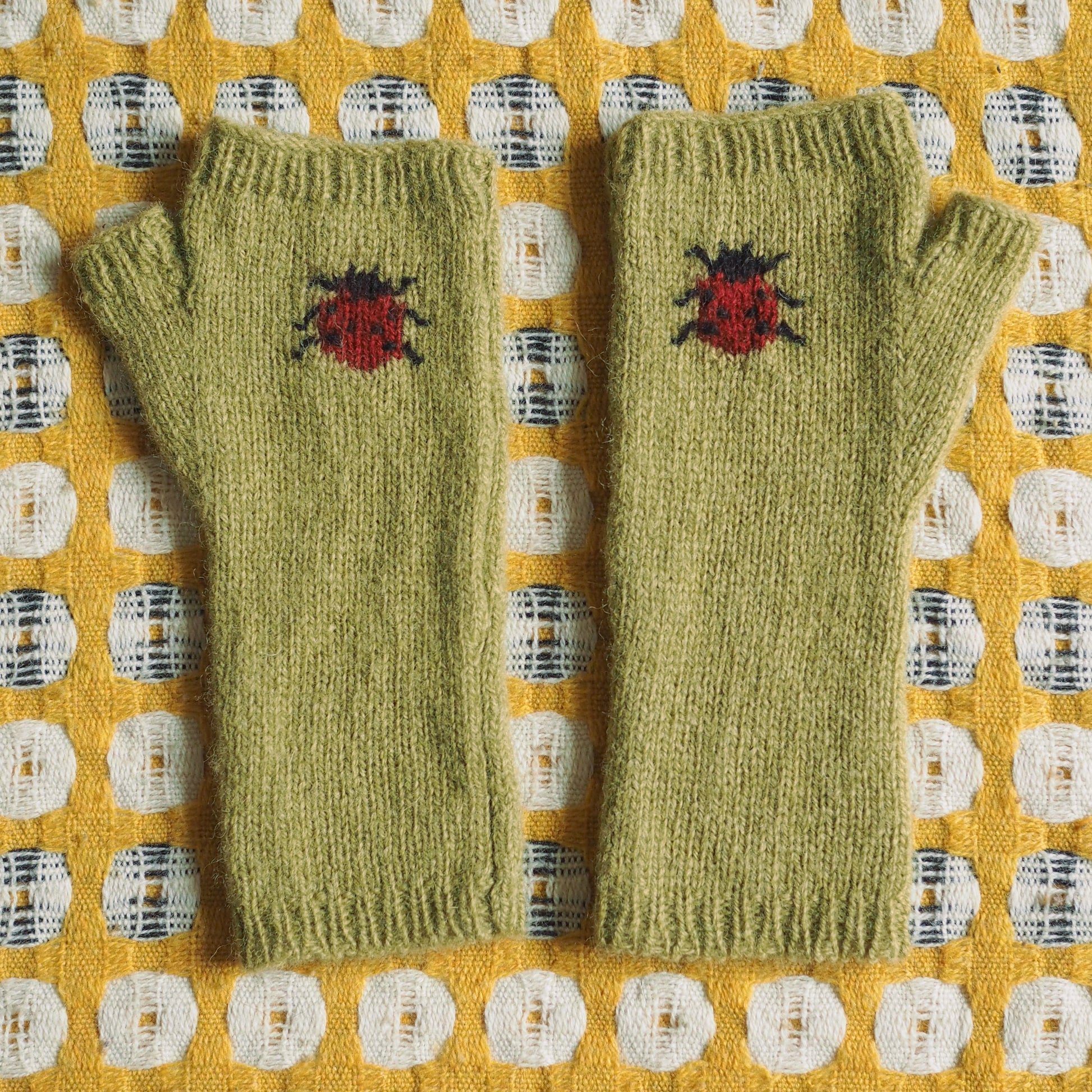 Handmade green fingerless gloves featuring a hand-embroidered red Ladybird. An all year round accessory made to keep your hands warm while keeping your fingers free. Made from Scottish Shetland wool. Each glove is completely unique due to the hand-embroidery.